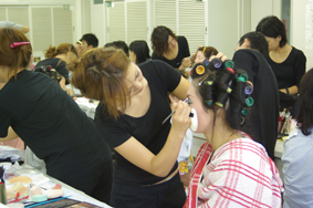 実践カリキュラム 今年も、9月2日に行われた、オペラの舞台でヘアメイクをメイクボックス生が担当しました。 劇団アンジェロによる「こうもり」という舞台です。 劇団アンジェロは、プロのオペラ歌手の集団ではなく、オペラに興味のある普通の方々が参加した劇団です。 しかしながら、みなさんよく練習されており、発声も本格的であり舞台もすごく楽しく、本格的な内容に感動です。 毎年、ミュージカルや日本舞踊など舞台の実習がありますがこれも舞台実習の一環として担当しています。 このあと、16日にも場所を変え上演します。 それも、メイクボックス生が担当です。 舞台メイクは、通常のメイクとは違い、特徴のあるメイク方法でみんなも練習を重ね、本番に挑んでいました。 メイクボックスには、まだまだいろんな実習が組み込まれています。